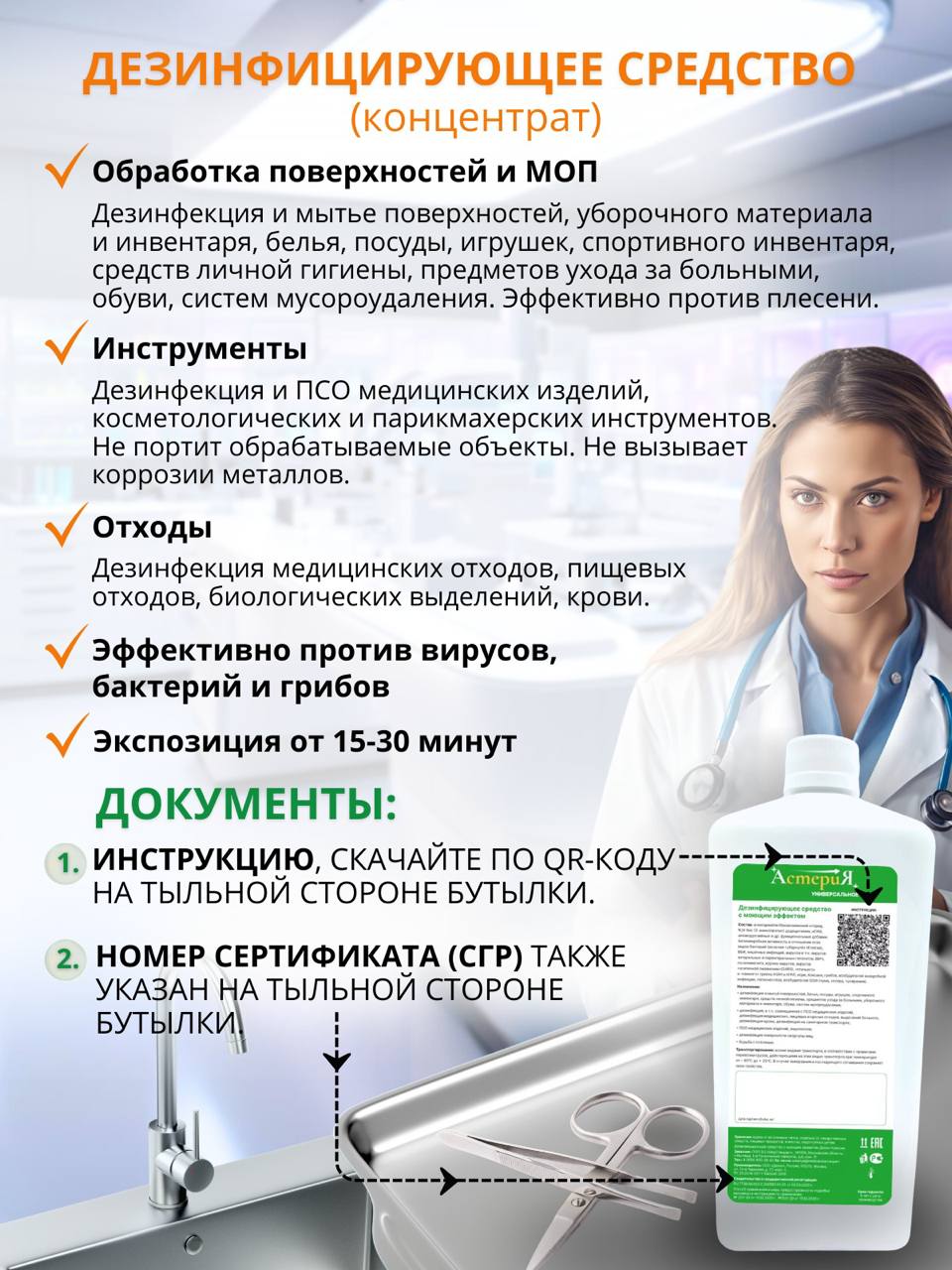 Дезинфицирующее средство «АстериЯ» с моющим эффектом 2 в 1 – универсальное решение для медицинских центров.